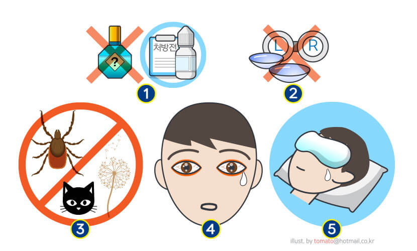 - 가려움증, 충혈 등의 증상을 완화시켜주는 막아주는 항히스타민 안약을 점안합니다.